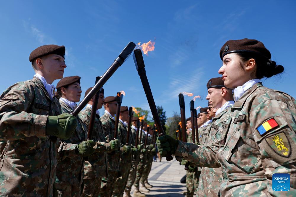 Soldiers light torches during a ceremony marking Romania's Land Forces Day at the Tomb of Unknown Soldier in Bucharest, Romania, April 23, 2026. (Photo by Cristian Cristel/Xinhua)