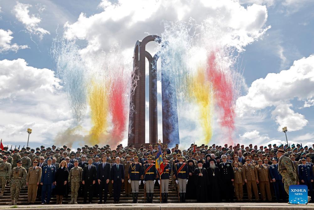 Soldiers and officials pose in front of the Tomb of Unknown Soldier during a ceremony marking Romania's Land Forces Day in Bucharest, Romania, April 23, 2026. (Photo by Cristian Cristel/Xinhua)