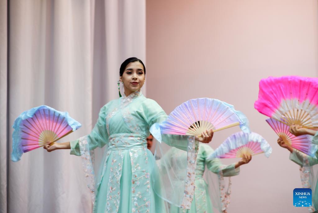 Students in costumes with traditional Chinese elements dance at the 2026 International Chinese Language Day event in Ashgabat, Turkmenistan, April 23, 2026. A celebration event marking the 2026 International Chinese Language Day was held here Thursday. (Photo by Cui Jiaxin/Xinhua)