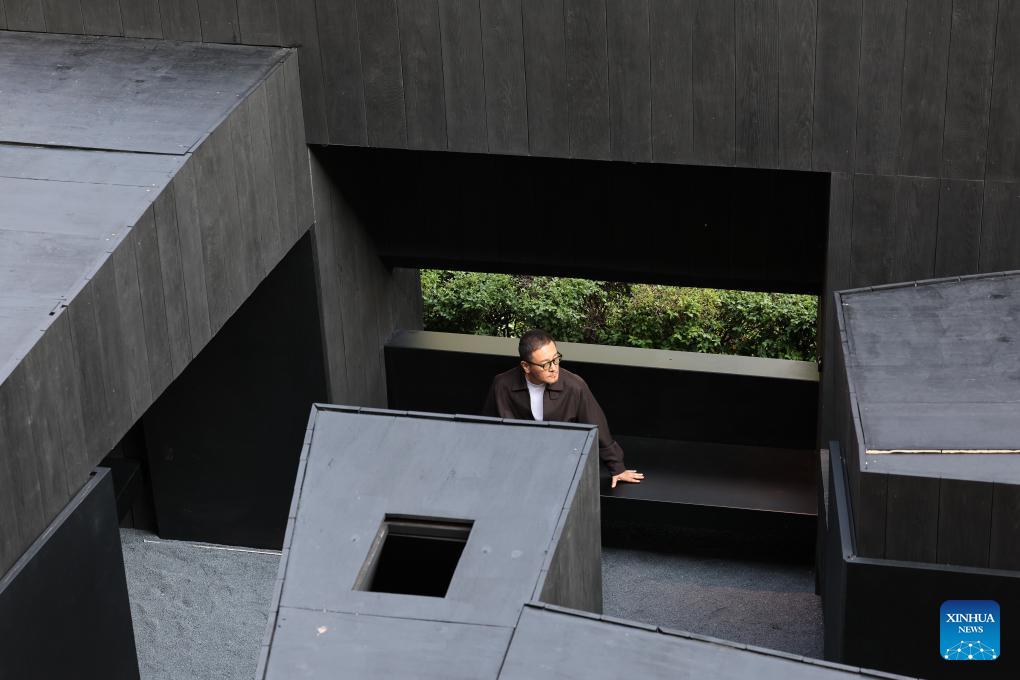 Chinese designer Wu Bin sits inside his installation work "Ao Ting" during Milan Design Week at the University of Milan in Milan, Italy, April 20, 2026. Chinese designs and products are drawing wide attention at the ongoing Salone del Mobile, or the Milan's furniture fair, a highlight of the Milan Design Week. (Xinhua/Li Jing)