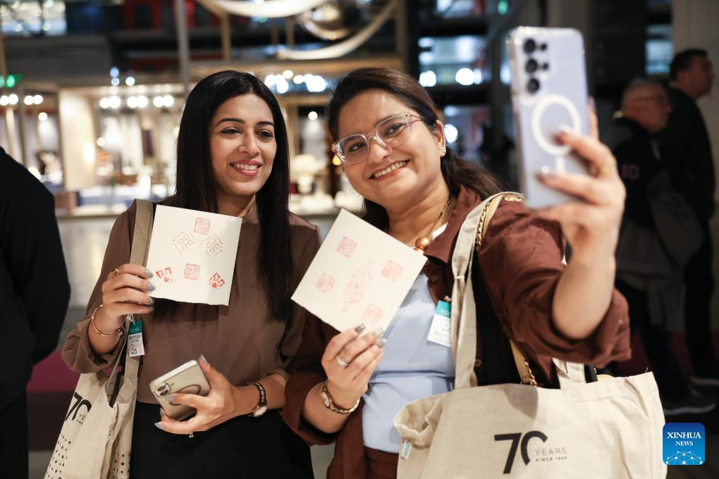 A visitor (C) prints a seal pattern with China's Lu'an seal ink paste during the 64th Salone del Mobile at Fiera Milano Rho exhibition center in Milan, Italy, April 22, 2026. Chinese designs and products are drawing wide attention at the ongoing Salone del Mobile, or the Milan's furniture fair, a highlight of the Milan Design Week. (Xinhua/Li Jing)
