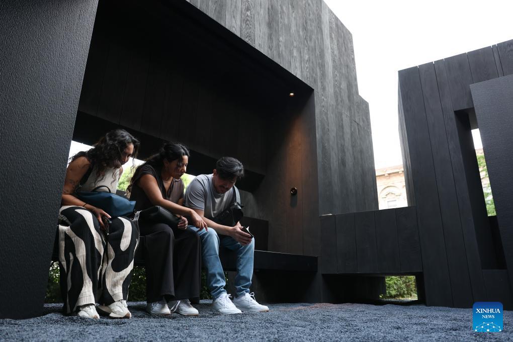 Visitors sit inside the installation work "Ao Ting" by Chinese designer Wu Bin during Milan Design Week at the University of Milan in Milan, Italy, April 20, 2026. Chinese designs and products are drawing wide attention at the ongoing Salone del Mobile, or the Milan's furniture fair, a highlight of the Milan Design Week. (Xinhua/Li Jing)