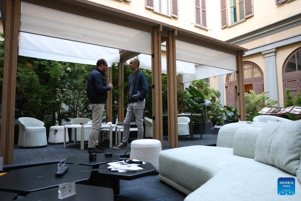 Exhibitors watch an outdoor design jointly developed by YARDCOM and Hong Kong designer Steve Leung during Milan Design Week in Milan, Italy, April 22, 2026. Chinese designs and products are drawing wide attention at the ongoing Salone del Mobile, or the Milan's furniture fair, a highlight of the Milan Design Week. (Xinhua/Li Jing)