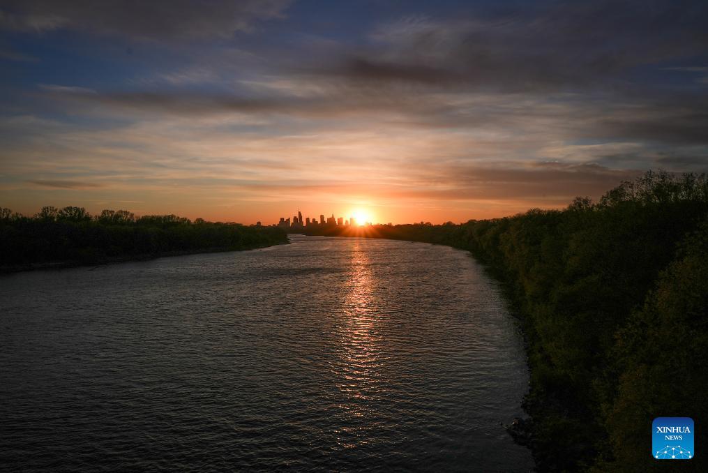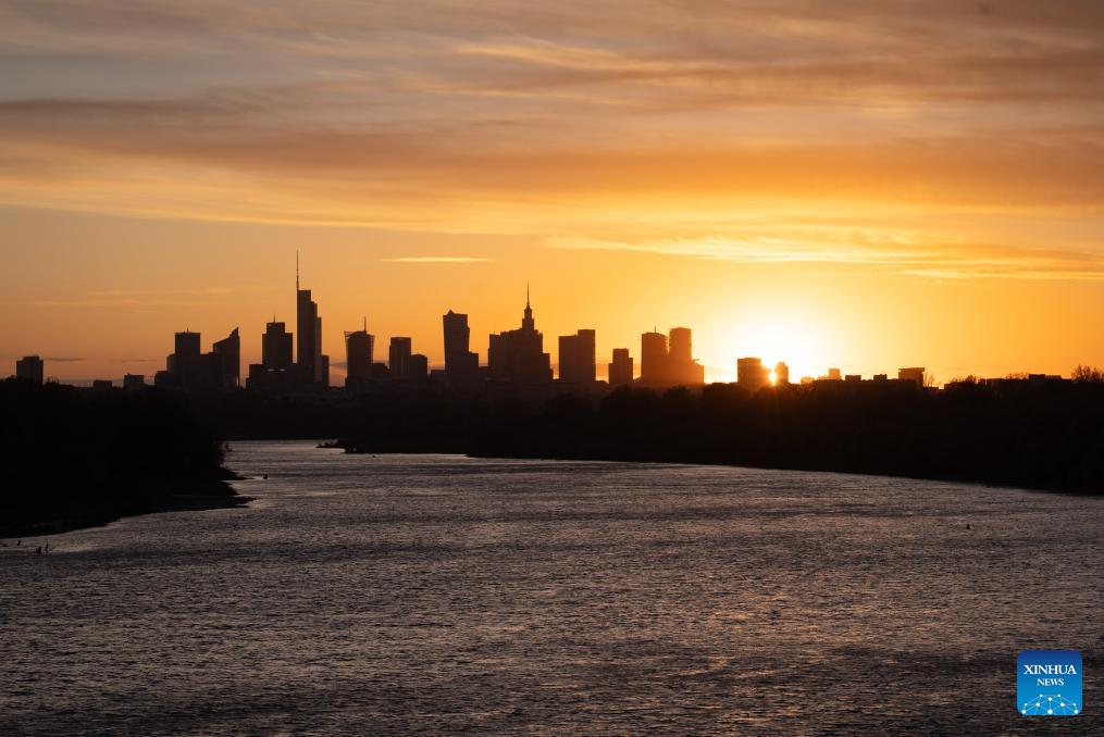 The skyline of Warsaw and the Vistula River are seen at sunset in Warsaw, Poland, April 23, 2026. (Photo by Jaap Arriens/Xinhua)