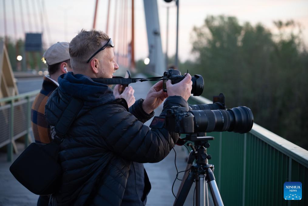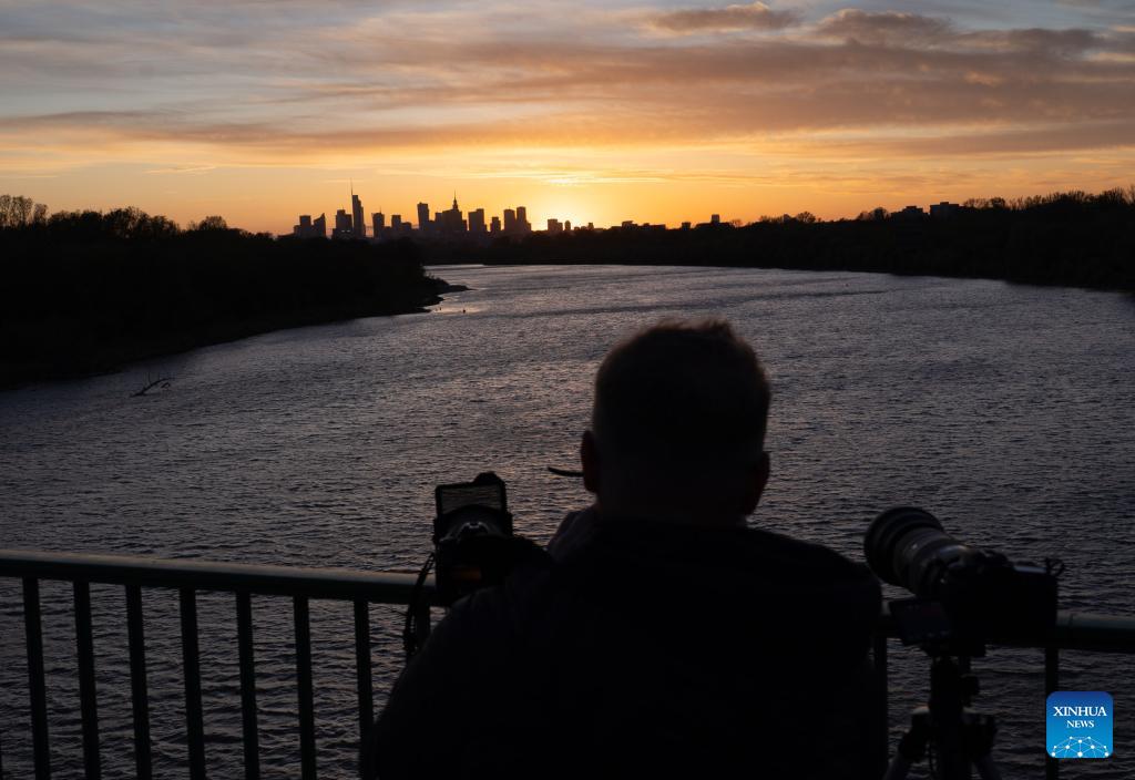 A man takes photos of the sunset scenery from a bridge over the Vistula River in Warsaw, Poland, April 23, 2026. (Photo by Jaap Arriens/Xinhua)