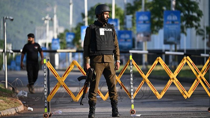 A police officer stands guard near the Serena Hotel, the venue for expected US-Iran talks in Islamabad, Pakistan, April 25, 2026. (Photo: VCG)