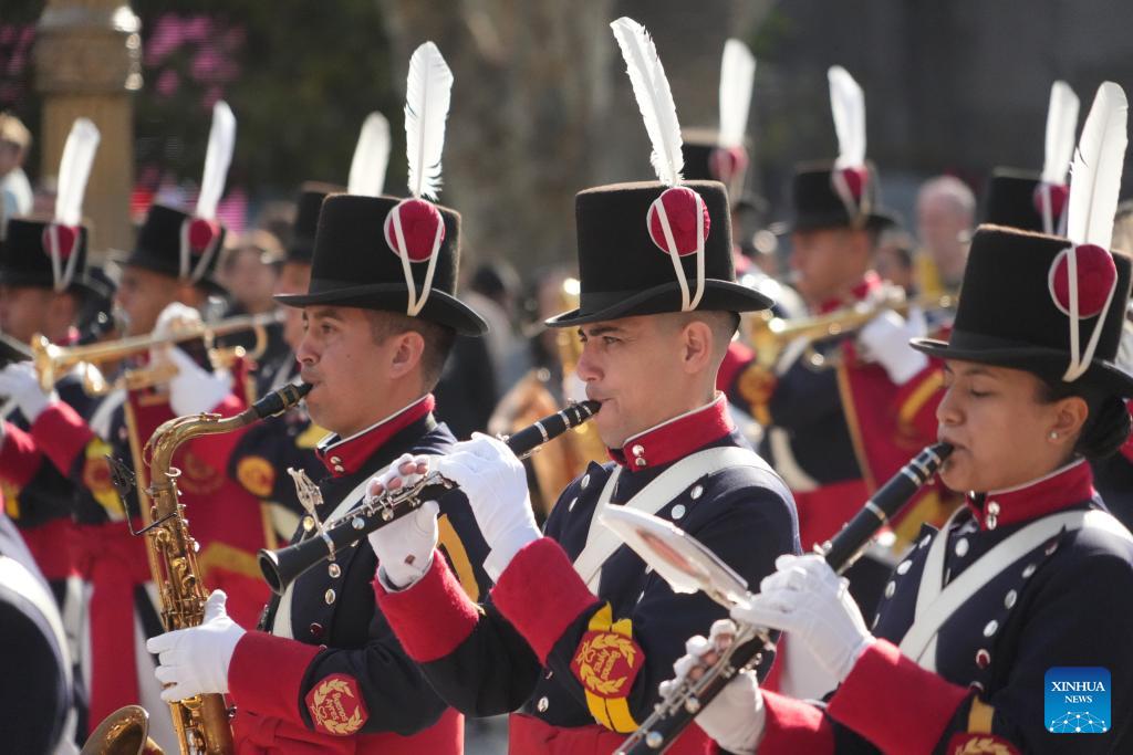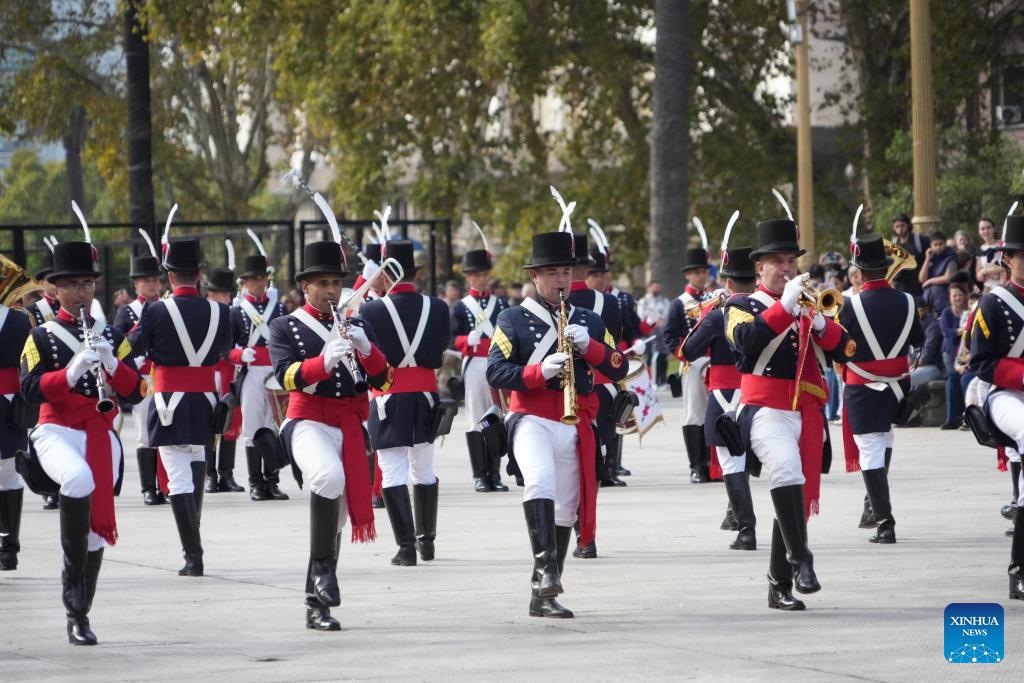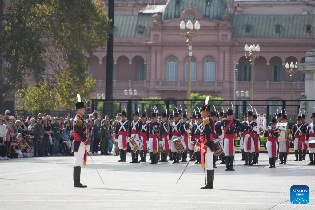 Soldiers in traditional uniforms perform during a traditional guard-changing ceremony in Buenos Aires, Argentina, April 25, 2026. (Xinhua/Zhang Duo)
