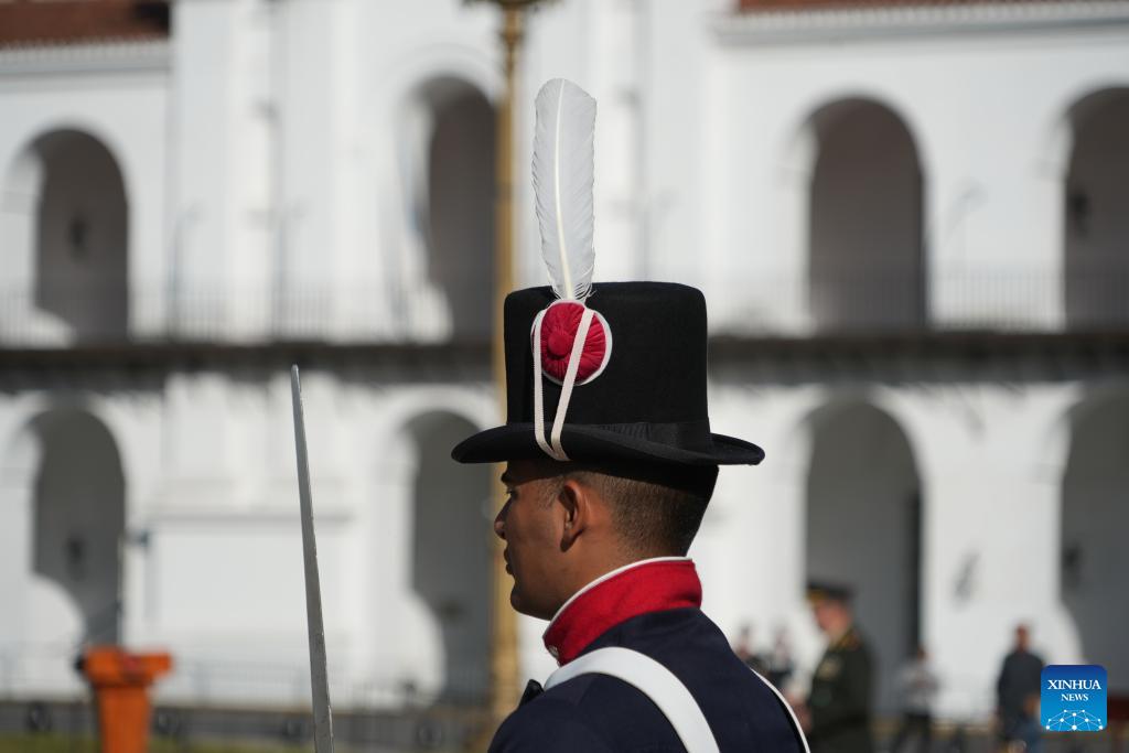 This photo taken on April 25, 2026 shows a soldier in traditional uniforms during a traditional guard-changing ceremony in Buenos Aires, Argentina. (Xinhua/Zhang Duo)