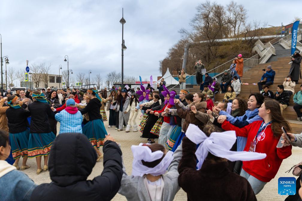Performers dance during the rhododendron festival in Vladivostok, Russia, April 25, 2026. The rhododendron festival was held here on Saturday to promote rhododendron-themed tourism and enhance its appeal to tourists. (Photo by Andrey Matveenko/Xinhua)
