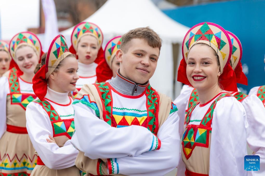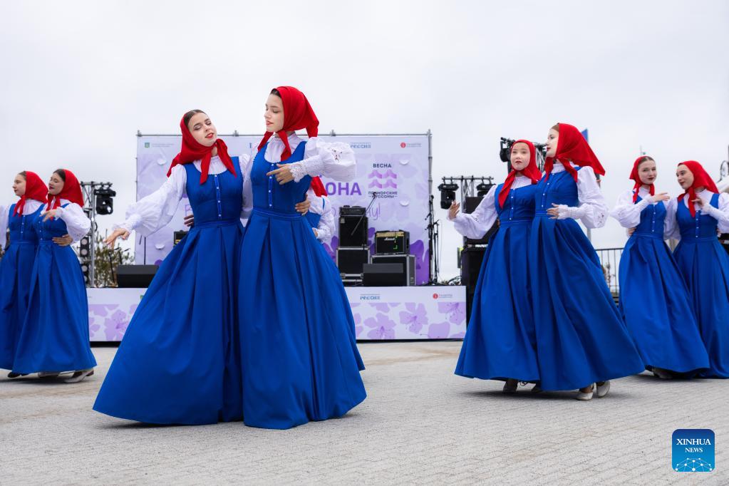 Performers are pictured during the rhododendron festival in Vladivostok, Russia on April 25, 2026. The rhododendron festival was held here on Saturday to promote rhododendron-themed tourism and enhance its appeal to tourists. (Photo by Andrey Matveenko/Xinhua)