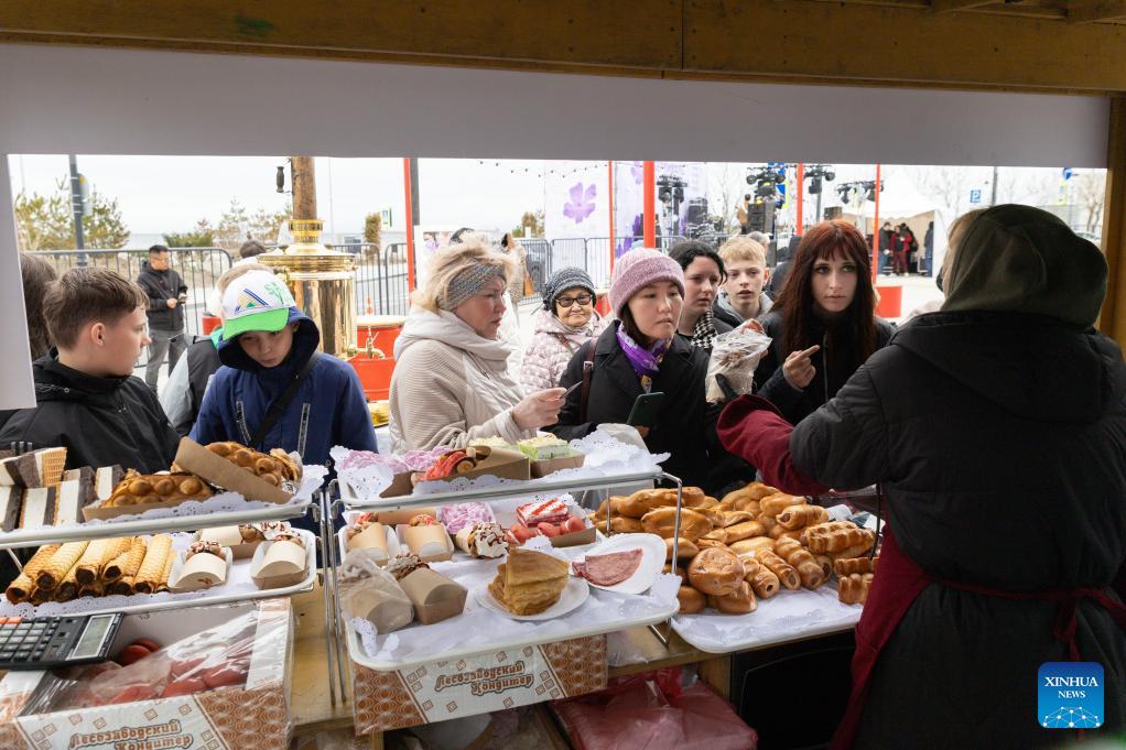 Visitors buy food during the rhododendron festival in Vladivostok, Russia, April 25, 2026. The rhododendron festival was held here on Saturday to promote rhododendron-themed tourism and enhance its appeal to tourists. (Photo by Andrey Matveenko/Xinhua)