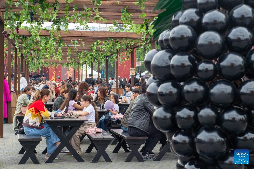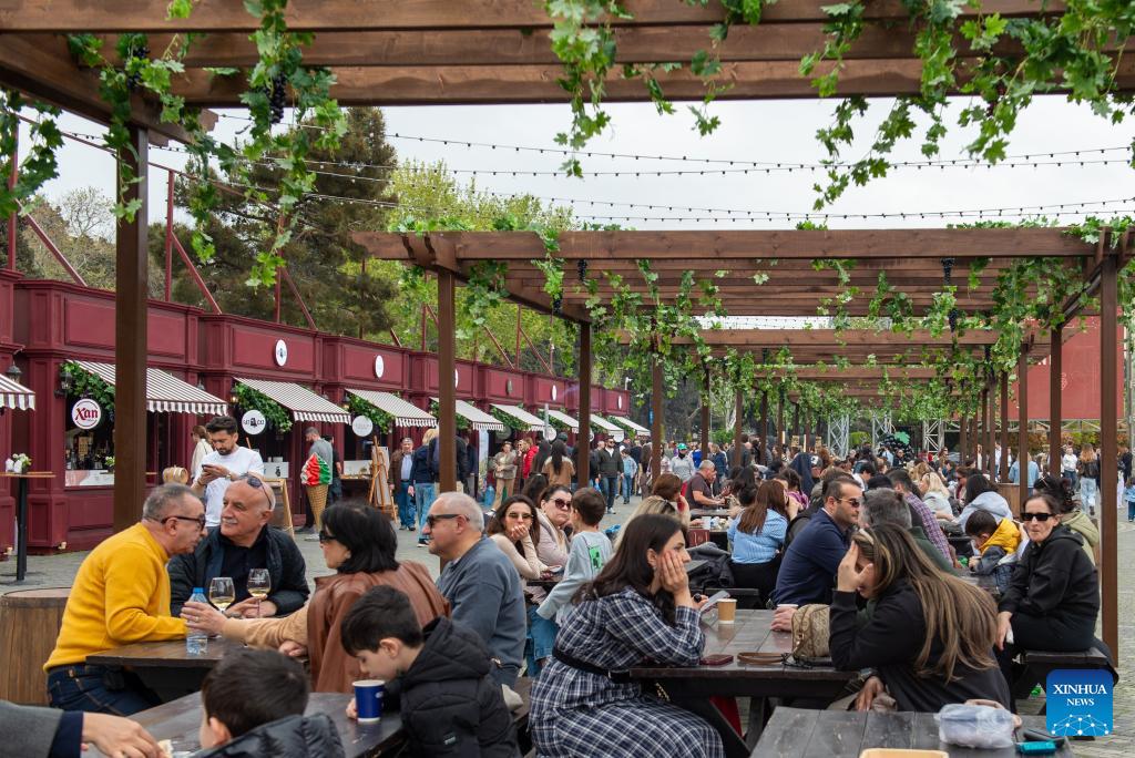 People relax and enjoy delicacies during the Jazz and Wine Festival at a seaside park in Baku, Azerbaijan, April 25, 2026. The ten-day event integrates Azerbaijan's indigenous wine-making traditions with musical art, bringing a relaxing and vibrant vibe to the city and drawing numerous locals and tourists for leisure and wine tasting. (Xinhua/Chen Junfeng)