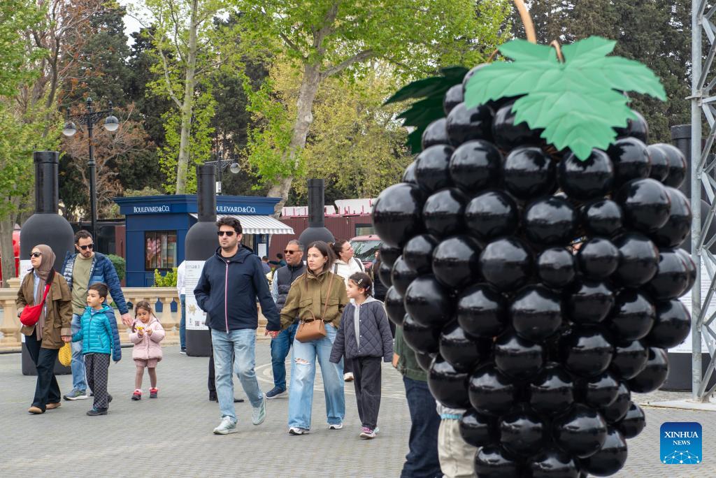 A girl hides behind a giant wine bottle installation as she plays hide-and-seek with adults during the Jazz and Wine Festival at a seaside park in Baku, Azerbaijan, April 25, 2026. The ten-day event integrates Azerbaijan's indigenous wine-making traditions with musical art, bringing a relaxing and vibrant vibe to the city and drawing numerous locals and tourists for leisure and wine tasting. (Xinhua/Chen Junfeng)