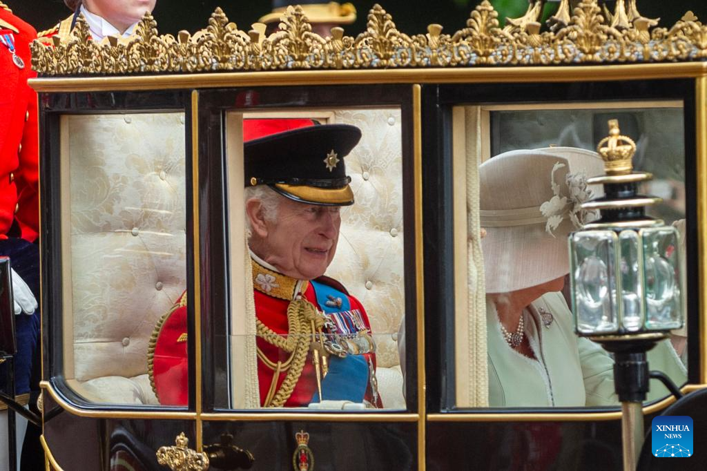 Britain's King Charles III and Queen Camilla ride a royal carriage during the Trooping the Colour parade to honour him on his official birthday in London, Britain, on June 15, 2024. (File photo: Xinhua)