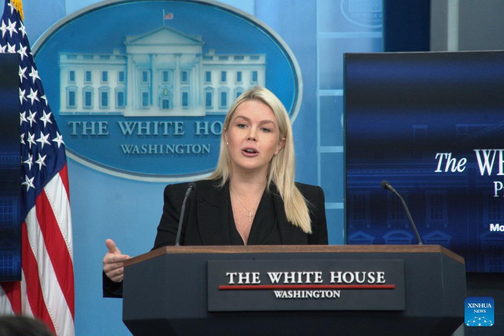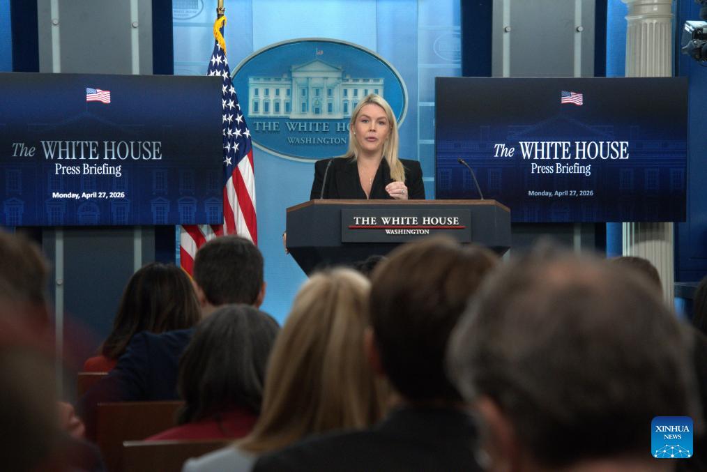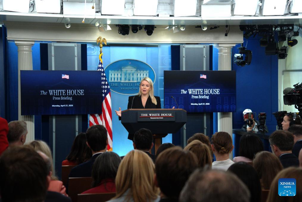 White House Press Secretary Karoline Leavitt speaks during a press briefing at the White House in Washington, D.C., the United States, April 27, 2026. (Photo by Li Yuanqing/Xinhua)