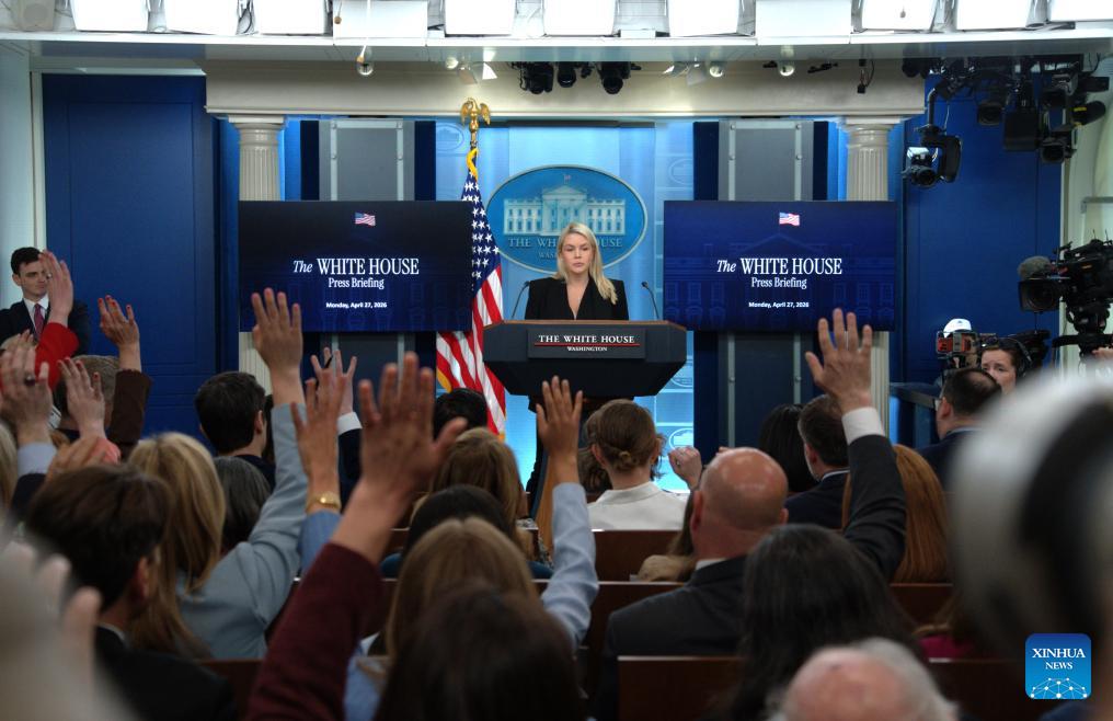 White House Press Secretary Karoline Leavitt takes questions during a press briefing at the White House in Washington, D.C., the United States, April 27, 2026. (Photo by Li Yuanqing/Xinhua)