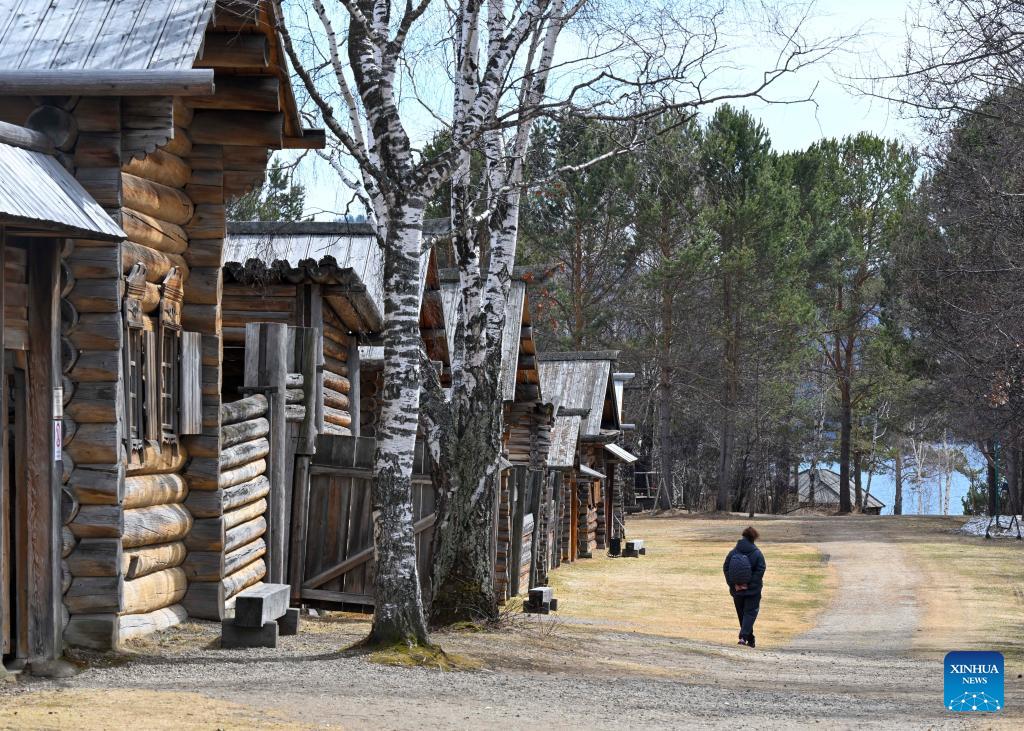 A tourist visits the Taltsy Architectural and Ethnographic Museum in Irkutsk, Russia, on April 28, 2026. (Xinhua/Hao Jianwei)