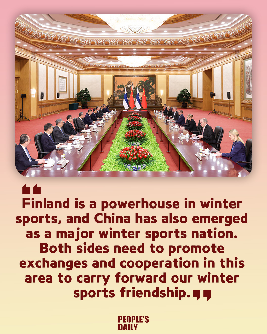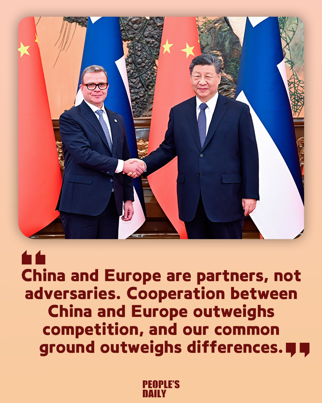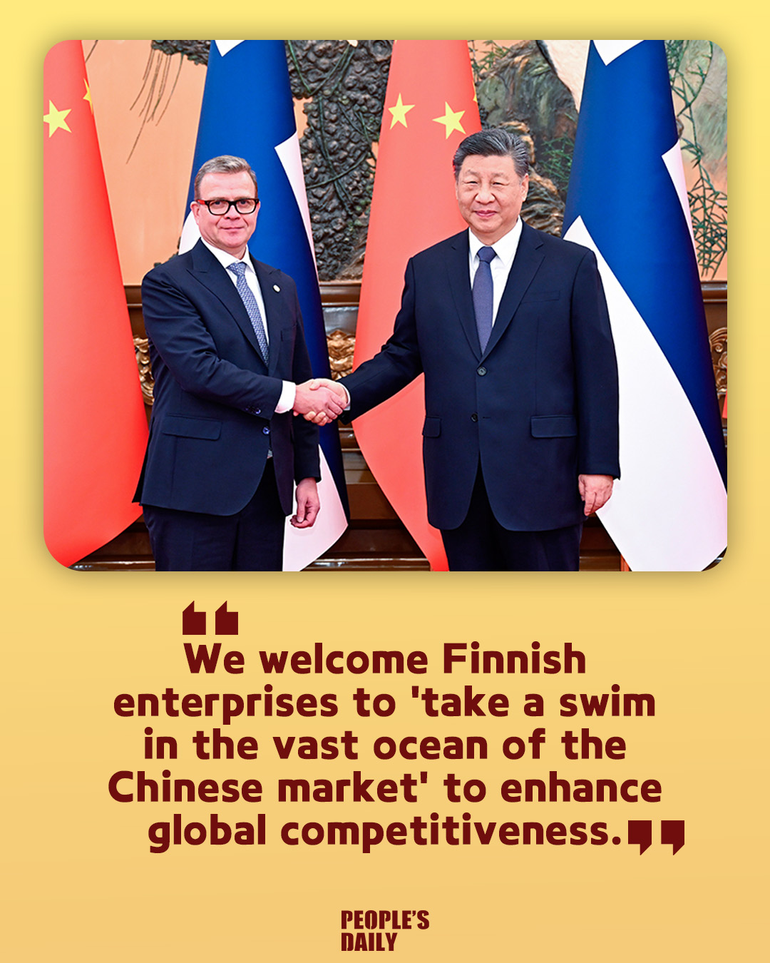 Chinese President Xi Jinping welcomed Finnish enterprises to "take a swim in the vast ocean of the Chinese market" to enhance their global competitiveness. Xi made the remarks when meeting with Finnish Prime Minister Petteri Orpo in Beijing, capital of China, on Tuesday. What other messages did Xi convey during the meeting? Check out these posters.