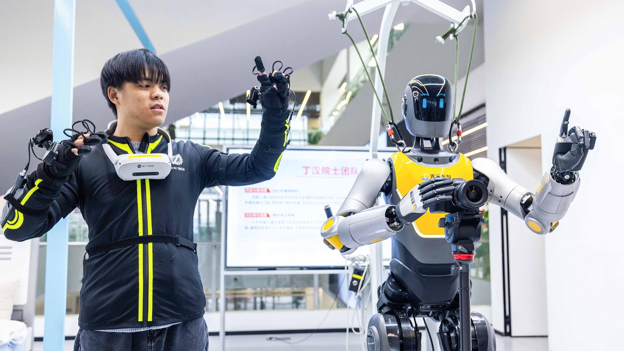 A humanoid robot replicates the physical movements of a motion capture actor at a humanoid robot innovation center in Wuhan, central China's Hubei Province, January 19, 2026. (Photo: VCG)