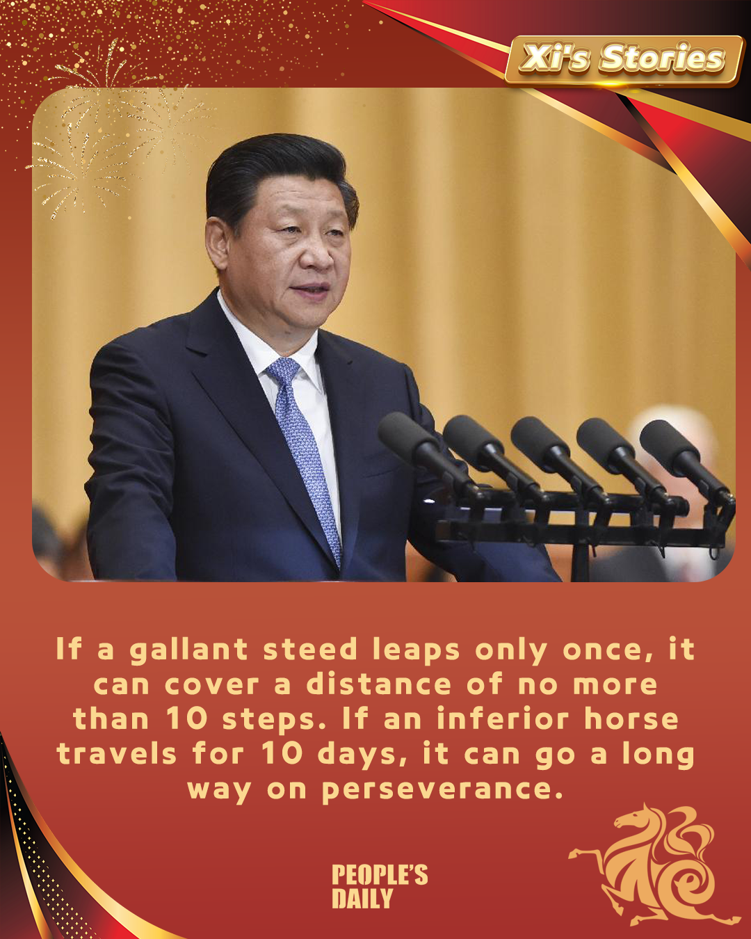 Xi quoted Xun Zi, a renowned Chinese philosopher who lived more than 2,000 years ago: "If a gallant steed leaps only once, it can cover a distance of no more than 10 steps. If an inferior horse travels for 10 days, it can go a long way on perseverance."