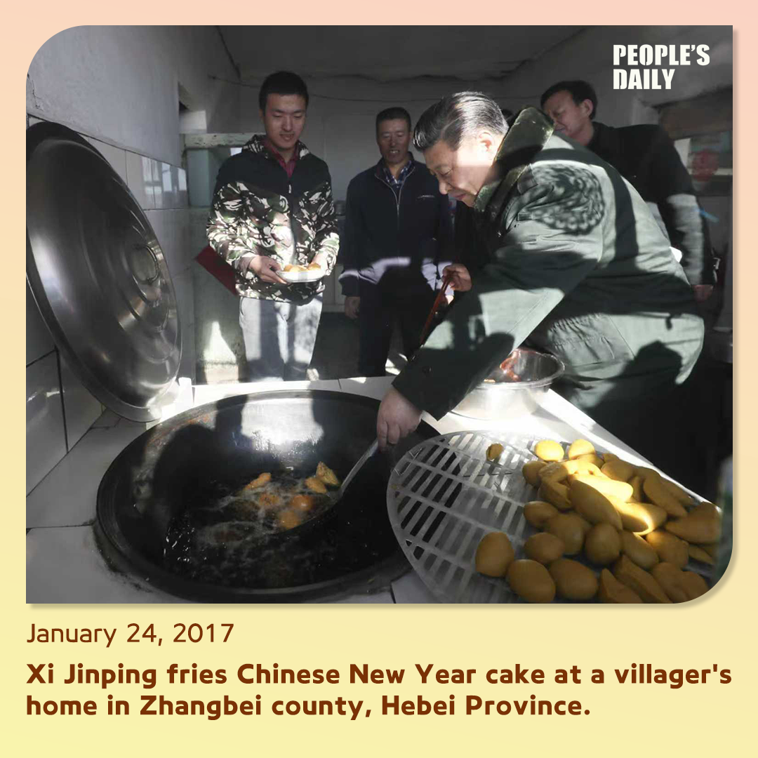 During this visit, Xi was invited by Xu to fry niangao, a fried rice cake traditionally served during Chinese New Year. Holding chopsticks and a strainer, Xi skillfully put them into a pan of hot oil and turned them upside down.