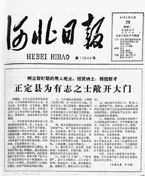 Xi Jinping presided over the formulation of nine measures to attract talent in Zhengding, Hebei Province, March 1983. Hebei Daily published a front-page headline highlighting the initiative on March 29 of that year. (File photo)