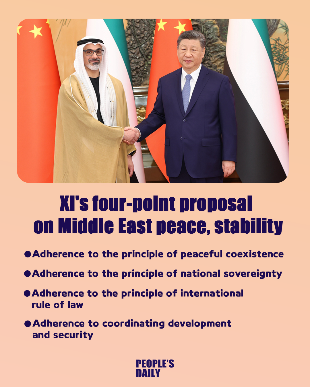 President Xi Jinping on Tuesday put forward a four-point proposal on promoting peace and stability in the Middle East, when meeting with Sheikh Khaled bin Mohamed bin Zayed Al Nahyan, Crown Prince of Abu Dhabi, United Arab Emirates, in Beijing.
